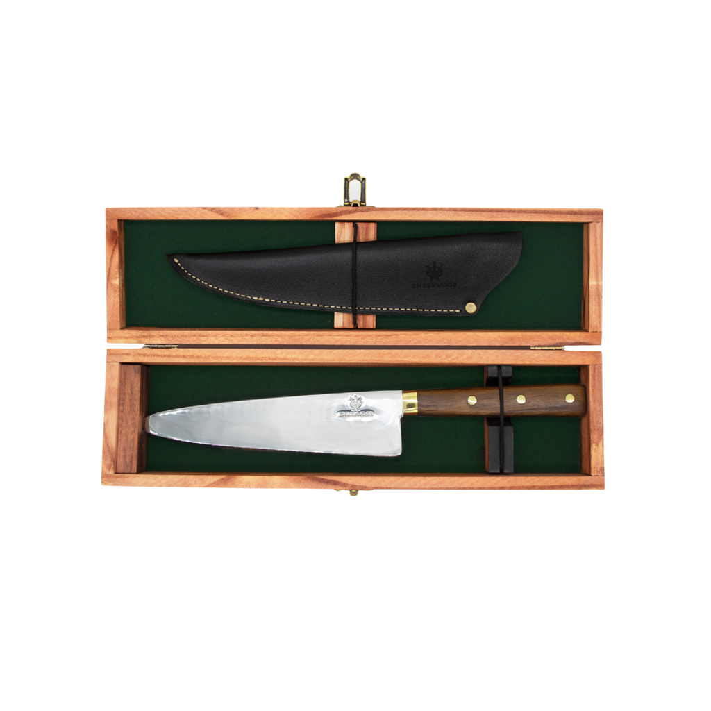 Cuchillo híbrido perfecto para cocinar todos los días. Nuestro cuchillo más funcional y versátil. Hoja de acero inoxidable de 20 cms, empuñadura de nogal brasileño y remates de latón. Incluye funda de piel.